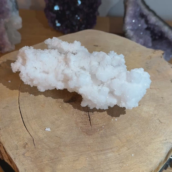Dieser weiße, funkelnde Aragonit von 279 g fasziniert durch seine kristalline Struktur und sein edles Glitzern. Das Licht bricht sich auf seinen Oberflächen und lässt ihn wie ein kleines Naturjuwel wirken – handlich, aber voller Ausdruckskraft.